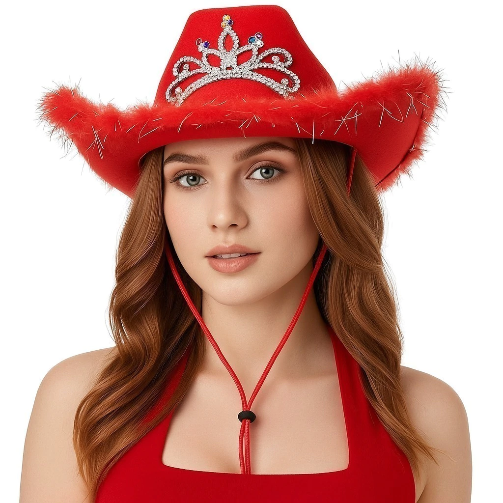 El 🤠 Gorro Cowboy con Plumas y Corona Strass ✨ es el accesorio perfecto para darle un toque llamativo, moderno y divertido a cu alquier fiesta o evento.
