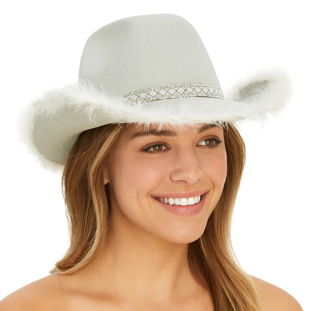 El 🤠 Gorro Cowboy Glitter Plumas y Dijes ✨ es el accesorio perfecto para darle un toque llamativo, moderno y divertido a cu alquier fiesta o evento.